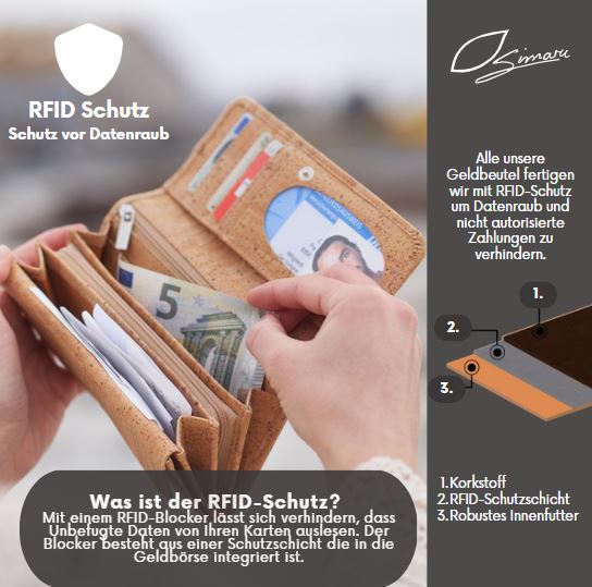 Der integrierte RFID-Blocker schützt deine sensiblen Daten vor Datendiebstahl & gehört zur Standard-Ausstattung unserer Geldbeutel.