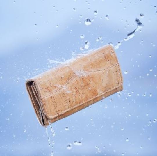 Kork - aus der nachwachsenden Rinde der Korkeiche - ist von Natur aus wasserabweisend und schützt den Inhalt deines Geldbeutels effektiv vor Nässe.