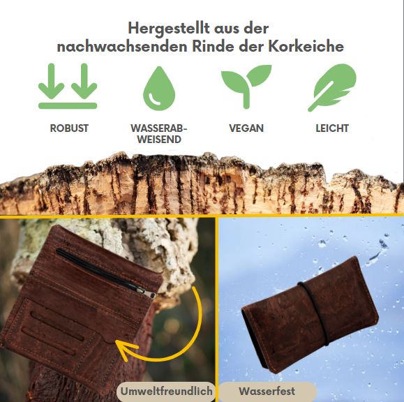 Zu allererst: Ja, unsere Produkte sind wirklich aus echtem Kork! Korkstoff oder auch Korkleder, wie es zur Herstellung von Mode-Accessoires verwendet wird, ist im Vergleich zu gepresstem Korkspan oder Weinkorken enorm robust und stabil & zugleich federleicht und weich. Kork-Accessoires wie Geldbeutel oder Taschen sehen auch nach monatelangem Gebrauch aus wie am ersten Tag und können jahrelang genutzt werden.