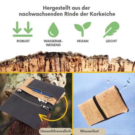 Zu allererst: Ja, unsere Produkte sind wirklich aus echtem Kork! Korkstoff oder auch Korkleder, wie es zur Herstellung von Mode-Accessoires verwendet wird, ist im Vergleich zu gepresstem Korkspan oder Weinkorken enorm robust und stabil & zugleich federleicht und weich. Kork-Accessoires wie Geldbeutel oder Taschen sehen auch nach monatelangem Gebrauch aus wie am ersten Tag und können jahrelang genutzt werden.