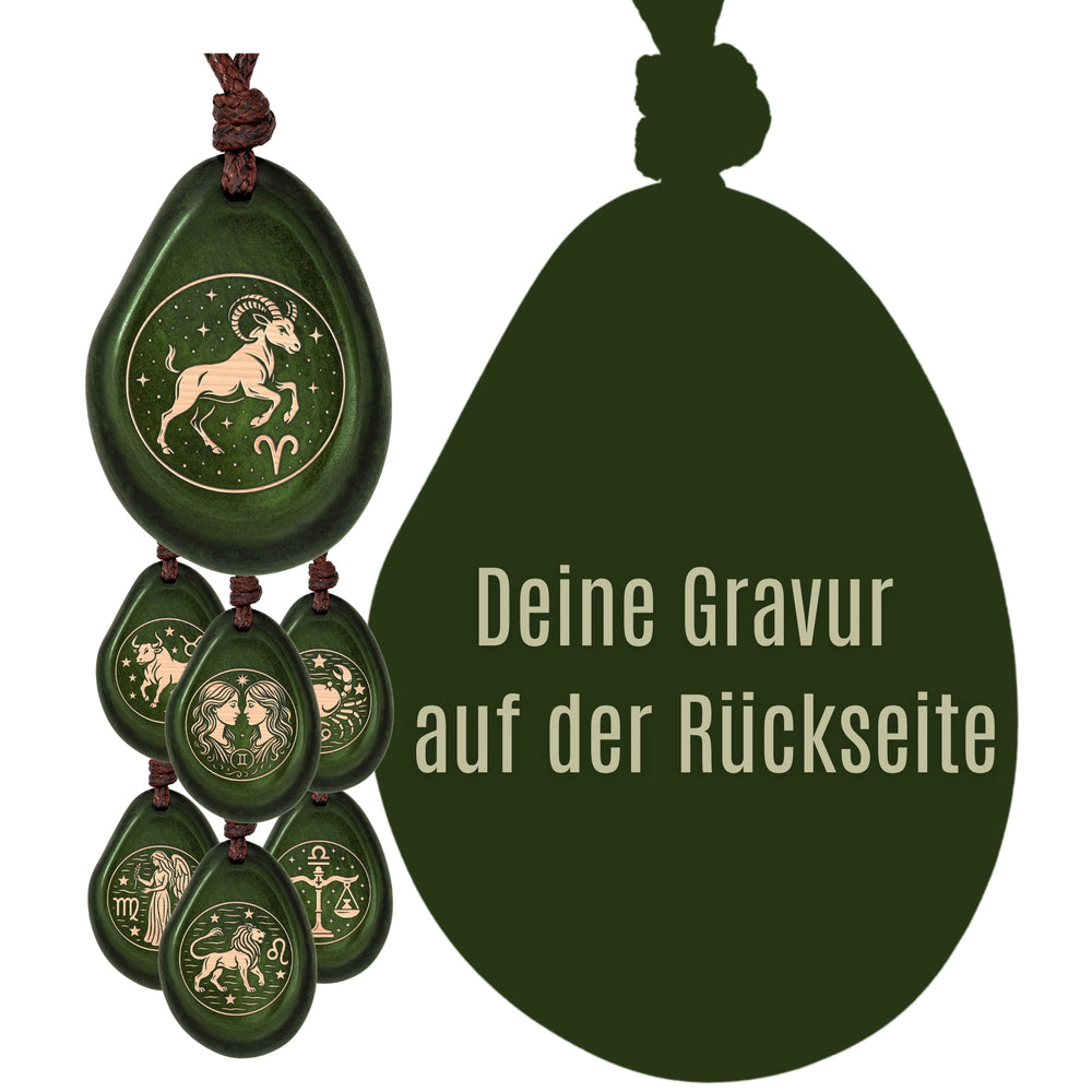 Der Anhänger besteht aus Tagua, auch bekannt als pflanzliches Elfenbein. Dieses nachhaltige Material wird aus den Nüssen der Tagua-Palme gewonnen, die in den tropischen Regenwäldern Südamerikas heimisch ist. Die Tagua-Nüsse werden von Hand geerntet, ohne den Baum zu beschädigen, was zur Erhaltung der Wälder beiträgt und lokale Gemeinschaften unterstützt. Nach der Ernte werden die Nüsse getrocknet, wodurch sie ihre harte, elfenbeinähnliche Konsistenz erhalten – ideal für feine Gravuren.