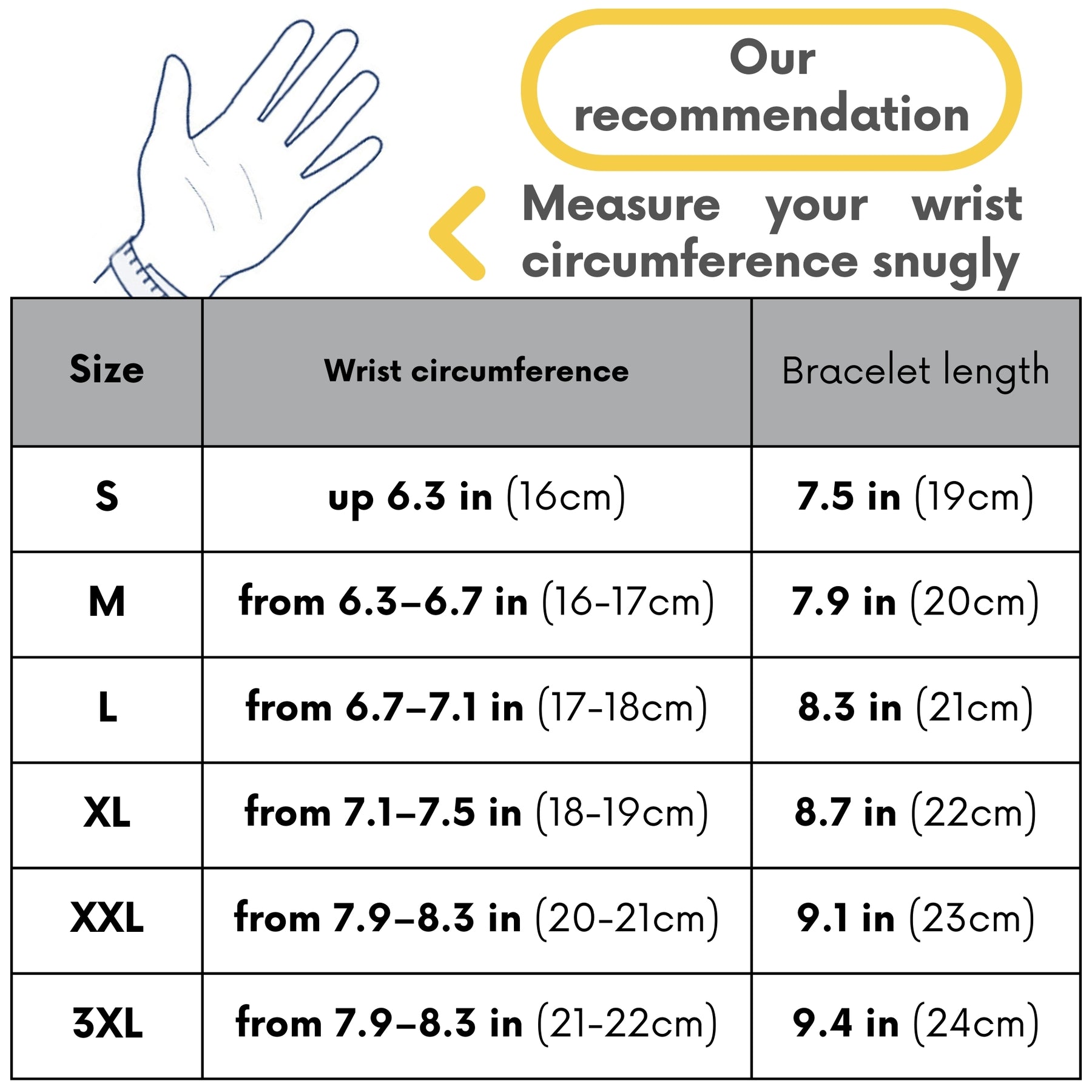 Before choosing a bracelet from us, you should know the right size. To do this, simply measure the wrist where you plan to wear the bracelet with a tape measure. When measuring, it's important that you wrap the tape measure tightly around your wrist without it pinching your wrist. As a rule of thumb, for the best possible comfort, you should be able to easily fit a finger between your wrist and the bracelet.