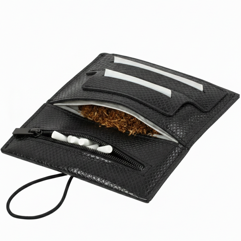 "There is no smoke without fire" - that's why our compact tobacco pouches have room for all the necessary features you need to smoke. In various extra compartments you can store your lighter, your filters and your leaflets in single or double packs.