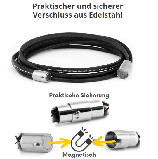 MAGNETVERSCHLUSS AUS EDELSTAHL: Der hochwertige Edelstahl-Magnetverschluss rundet dieses modische Lederarmband ab. Der praktische Verschluss ist extrem robust und erlaubt ein leichtes An- und Ablegen des Armbands.